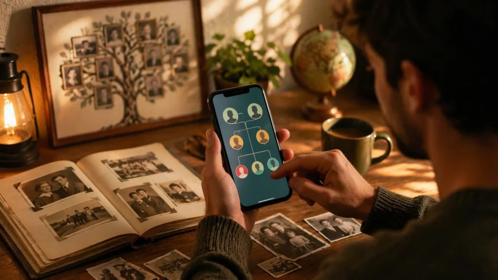 Além disso, hoje não é mais preciso passar horas em arquivos antigos ou procurar documentos difíceis. Com a ajuda do celular, ficou muito mais fácil organizar parentes, pesquisar nomes e explorar histórias familiares.